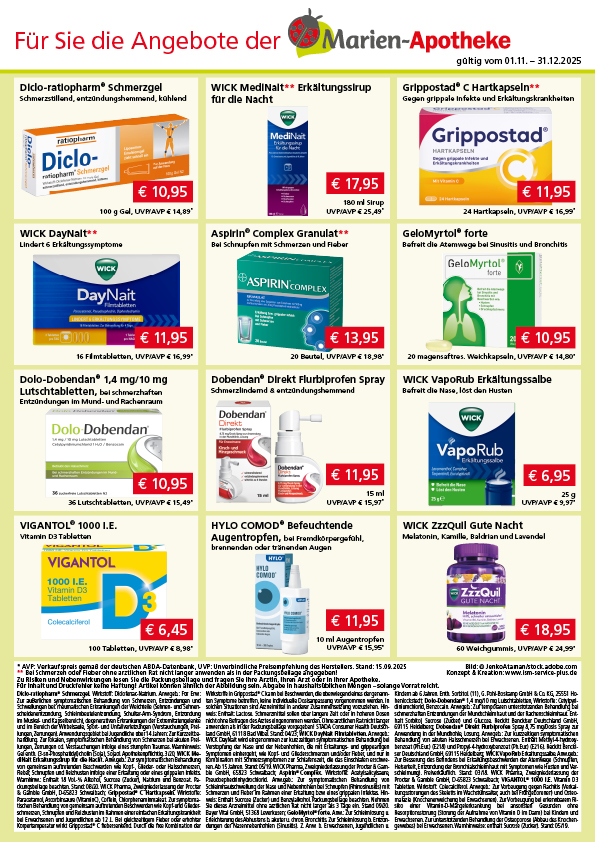 Diclo-ratiopharm® Schmerzgel. Wirkstoff: Diclofenac-Natrium. Anw.geb.: Für Erw.: Zur äußerlichen symptomatischen Behandlung von Schmerzen, Entzündungen und Schwellungen bei: rheumatischen Erkrankungen der Weichteile (Sehnen- und Sehnenscheidenentzündung, Schleimbeutelentzündung, Schulter-Arm-Syndrom, Entzündung im Muskel- und Kapselbereich), degenerativen Erkrankungen der Extremitätengelenke und im Bereich der Wirbelsäule, Sport- und Unfallverletzungen (Verstauchungen, Prellungen, Zerrungen). Anwendungsgebiet bei Jugendliche über 14 Jahren: Zur Kurzzeitbehandlung. Zur lokalen, symptomatischen Behandlung von Schmerzen bei akuten Prellungen, Zerrungen od. Verstauchungen infolge eines stumpfen Traumas. Warnhinweis: Gel enth. (3-sn-Phosphatidyl)cholin (Soja), Sojaöl. Apothekenpflichtig. 3/20; WICK MediNait Erkältungssirup für die Nacht. Anw.geb.: Zur symptomatischen Behandlung von gemeinsam auftretenden Beschwerden wie Kopf-, Glieder- oder Halsschmerzen, Fieber, Schnupfen und Reizhusten infolge einer Erkältung oder eines grippalen Infekts. Warnhinw.: Enthält 18 Vol.-% Alkohol, Sucrose (Zucker), Natrium und Benzoat. Packungsbeilage beachten. Stand: 08/20. WICK Pharma, Zweigniederlassung der Procter & Gamble GmbH, D-65823 Schwalbach; Grippostad® C Hartkapseln. Wirkstoffe: Paracetamol, Ascorbinsäure (VitaminC), Coffein, Chlorphenaminmaleat. Zur symptomatischen Behandlung von gemeinsam auftretenden Beschwerden wie Kopf-und Gliederschmerzen, Schnupfen und Reizhusten im Rahmen einer einfachen Erkältungskrankheit bei Erwachsenen und Jugendlichen ab 12 J.. Bei gleichzeitigem Fieber oder erhöhter Körpertemperatur wirkt Grippostad® C fiebersenkend. Durch die fixe Kombination der Wirkstoffe in Grippostad® C kann bei Beschwerden, die überwiegend eines der genannten Symptome betreffen, keine individuelle Dosisanpassung vorgenommen werden. In solchen Situationen sind Arzneimittel in anderer Zusammensetzung vorzuziehen. Hinweis: Enthält: Lactose. Schmerzmittel sollen über längere Zeit oder in höheren Dosen nicht ohne Befragen des Arztes eingenommen werden. Ohne ärztlichen Rat nicht länger anwenden als in der Packungsbeilage vorgegeben! STADA Consumer Health Deutschland GmbH, 61118 Bad Vilbel. Stand: 04/23; WICK DayNait Filmtabletten. Anw.geb.: WICK DayNait wird eingenommen zur kurzzeitigen symptomatischen Behandlung bei Verstopfung der Nase und der Nebenhöhlen, die mit Erkältungs- und grippeartigen Symptomen einhergeht, wie Kopf- und Gliederschmerzen und/oder Fieber, und nur in Kombination mit Schmerzsymptomen zur Schlafenszeit, die das Einschlafen erschweren. Ab 15 Jahren. Stand: 05/19. WICK Pharma, Zweigniederlassung der Procter & Gamble GmbH, 65823 Schwalbach; Aspirin® Complex. Wirkstoffe: Acetylsalicylsäure, Pseudoephedrinhydrochlorid. Anw.geb.: Zur symptomatischen Behandlung von Schleimhautschwellung der Nase und Nebenhöhlen bei Schnupfen (Rhinosinusitis) mit Schmerzen und Fieber im Rahmen einer Erkältung bzw. eines grippalen Infektes. Hinweis: Enthält Sucrose (Zucker) und Benzylalkohol. Packungsbeilage beachten. Nehmen Sie dieses Arzneimittel ohne ärztlichen Rat nicht länger als 3 Tage ein. Stand 09/20. Bayer Vital GmbH, 51368 Leverkusen; GeloMyrtol® forte. Anw.: Zur Schleimlösung u. Erleichterung des Abhustens b. akuter u. chron. Bronchitis. Zur Schleimlösung b. Entzündungen der Nasennebenhöhlen (Sinusitis). Z. Anw. b. Erwachsenen, Jugendlichen u. Kindern ab 6 Jahren. Enth. Sorbitol. (11), G. Pohl-Boskamp GmbH & Co. KG, 25551 Hohenlockstedt; Dolo-Dobendan® 1,4 mg/10 mg Lutschtabletten, Wirkstoffe: Cetylpyridiniumchlorid, Benzocain. Anw.geb.: Zur temporären unterstützenden Behandlung bei schmerzhaften Entzündungen der Mundschleimhaut und der Rachenschleimhaut. Enthält Sorbitol, Sucrose (Zucker) und Glucose. Reckitt Benckiser Deutschland GmbH, 69115 Heidelberg; Dobendan® Direkt Flurbiprofen Spray 8,75 mg/Dosis Spray zur Anwendung in der Mundhöhle, Lösung. Anw.geb.: Zur kurzzeitigen symptomatischen Behandlung von akuten Halsschmerzen bei Erwachsenen. Enthält Methyl-4-hydroxybenzoat (Ph.Eur.) (E218) und Propyl-4-hydroxybenzoat (Ph.Eur.) (E216). Reckitt Benckiser Deutschland GmbH, 69115 Heidelberg; WICK VapoRub Erkältungssalbe. Anw.geb.: Zur Besserung des Befindens bei Erkältungsbeschwerden der Atemwege (Schnupfen, Heiserkeit, Entzündung der Bronchialschleimhaut mit Symptomen wie Husten und Verschleimung). Freiverkäuflich. Stand: 03/18. WICK Pharma, Zweigniederlassung der Procter & Gamble GmbH, D-65823 Schwalbach; VIGANTOL® 1000 I.E. Vitamin D3 Tabletten. Wirkstoff: Colecalciferol. Anw.geb.: Zur Vorbeugung gegen Rachitis (Verkalkungsstörungen des Skeletts im Wachstumsalter, auch bei Frühgeborenen) und Osteomalazie (Knochenerweichung bei Erwachsenen). Zur Vorbeugung bei erkennbarem Risiko einer Vitamin-D-Mangelerkrankung bei ansonsten Gesunden ohne Resorptionsstörung (Störung der Aufnahme von Vitamin D im Darm) bei Kindern und Erwachsenen. Zur unterstützenden Behandlung der Osteoporose (Abbau des Knochengewebes) bei Erwachsenen. Warnhinweise: enthält Sucrose (Zucker). Stand: 05/19.