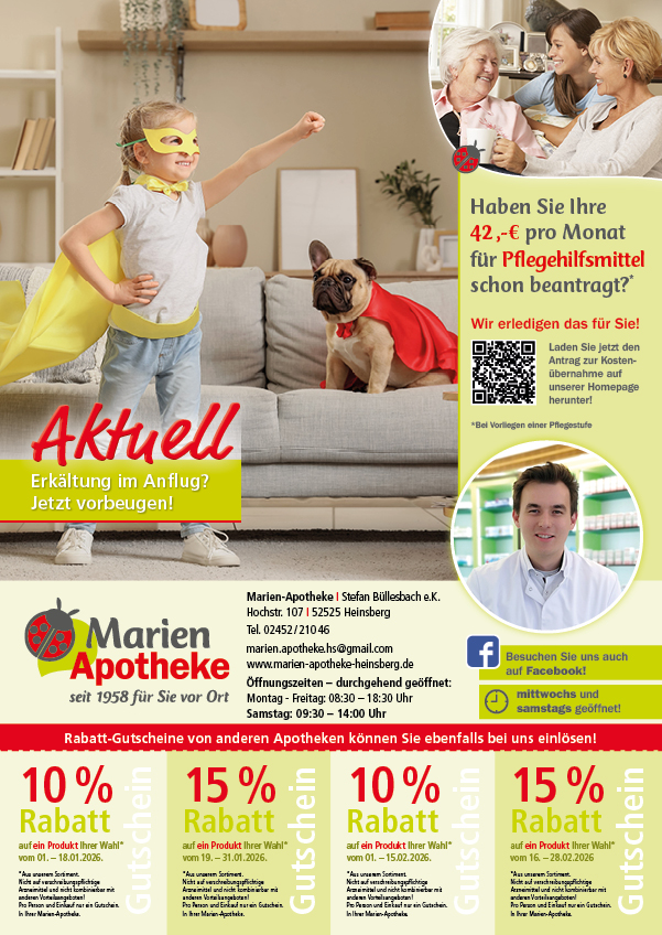 Voltaren Schmerzgel forte 23,2 mg/g Gel Wirkstoff: Diclofenac-N-Ethylethanamin. Anwendungsgebiete: Erwachsene und Jugendliche ab 14 Jahren: Zur lokalen, symptomatischen Behandlung von Schmerzen bei akuten Prellungen, Zerrungen oder Verstauchungen infolge eines stumpfen Traumas, z. B. Sport- und Unfallverletzungen. Bei Jugendlichen ab 14 Jahren ist das Arzneimittel zur Kurzzeitbehandlung vorgesehen. Warnhinweis: Enthält Propylenglycol, Butylhydroxytoluol und einen Duftstoff mit Eukalyptus, Benzylalkohol, Citronellol, Cumarin, D-Limonen, Eugenol, Geraniol und Linalool. Apothekenpflichtig. Stand:01/24. Haleon Germany GmbH, 80339 München; WICK DayNait Filmtabletten. Anwendungsgebiete: WICK DayNait wird eingenommen zur kurzzeitigen symptomatischen Behandlung bei Verstopfung der Nase und der Nebenhöhlen, die mit Erkältungs- und grippeartigen Symptomen einhergeht, wie Kopf- und Gliederschmerzen und/oder Fieber, und nur in Kombination mit Schmerzsymptomen zur Schlafenszeit, die das Einschlafen erschweren. Ab 15 Jahren. Warnhinw.: Arzneimittel für Kinder unzugänglich aufbewahren. Ohne ärztlichen Rat nicht länger anwenden als in der Packungsbeilage vorgegeben! Stand: 06/24. WICK Pharma, Zweigniederlassung der Procter & Gamble GmbH, 65823 Schwalbach; Aspirin® Complex. Wirkstoffe: Acetylsalicylsäure, Pseudoephedrinhydrochlorid. Anwendungsgebiete: Zur symptomatischen Behandlung von Schleimhautschwellung der Nase und Nebenhöhlen bei Schnupfen (Rhinosinusitis) mit Schmerzen und Fieber im Rahmen einer Erkältung bzw. eines grippalen Infektes. Hinweis: Enthält Sucrose (Zucker) und Benzylalkohol. Packungsbeilage beachten. Nehmen Sie dieses Arzneimittel ohne ärztlichen Rat nicht länger als 3 Tage ein. Stand 09/20. Bayer Vital GmbH, 51368 Leverkusen; Meditonsin® Tropfen Die Anwendungsgebiete leiten sich von den homöopathischen Arzneimittelbildern ab. Dazu gehören: Akute Entzündungen des Hals-, Nasen- und Rachenraumes. Meditonsin® Tropfen enthält 6 Vol.-% Alkohol. Meditonsin® Globuli enthält Saccharose. Stand: 01/22. MEDICE Arzneimittel, 58638 Iserlohn; ACC® akut 600 mg Hustenlöser, Brausetabletten: Wirkstoff: Acetylcystein. Anwendungsgebiet: Zur Schleimlösung und zum erleichterten Abhusten bei Atemwegserkrankungen mit zähem Schleim. Warnhinweis: Enthält Lactose, Sorbitol und Natriumverbindungen. Mat.-Nr.: 2/51015820 Stand: 04/23. Hexal AG, 83607 Holzkirchen; GeloMyrtol® forte. Anw.: Zur Schleimlösung u. Erleichterung des Abhustens b. akuter u. chron. Bronchitis. Zur Schleimlösung b. Entzündungen der Nasennebenhöhlen (Sinusitis). Z. Anw. b. Erwachsenen, Jugendlichen u. Kindern ab 6 Jahren. Enth. Sorbitol. (11), G. Pohl-Boskamp GmbH & Co. KG, 25551 Hohenlockstedt; Bronchicum® Elixir. Anwendungsgebiete: Behandlung der Symptome einer akuten Bronchitis und Erkältungskrankheiten der Atemwege mit zähflüssigem Schleim. Warnhinweise: Enthält 39 mg Alkohol (Ethanol) pro 1 ml Flüssigkeit entsprechend 2,9 % (w/w), Saccharose, Invertzucker und Natriumbenzoat. Packungsbeilage beachten. Stand 05/24. Maria Clementine Martin Klosterfrau Vertriebsgesellschaft mit beschränkter Haftung, 50606 Köln; nasic® Anwendungsgebiete: Zur Abschwellung der Nasenschleimhaut bei Schnupfen und zur unterstützenden Behandlung der Heilung von Haut- und Schleimhautschäden, anfallsweise auftretendem Fließschnupfen und zur Behandlung der Nasenatmungsbehinderung nach operativen Eingriffen an der Nase. Zur Abschwellung der Nasenschleimhaut bei Schnupfen in Verbindung mit akuten Entzündungen der Nasennebenhöhlen. nasic® ist für Erwachsene und Schulkinder bestimmt. Maria Clementine Martin Klosterfrau Vertriebsgesellschaft mit beschränkter Haftung, 50606 Köln; Magnesium Verla® N Dragées. Wirkstoffe: Magnesiumcitrat, Magnesiumbis(hydrogen-L-glutamat). Anwendungsgebiete: Behandlung von therapiebedürftigen Magnesiummangelzuständen, die keiner Injektion/Infusion bedürfen. Nachgewiesener Magnesiummangel, wenn er Ursache für Störungen der Muskeltätigkeit (neuromuskuläre Störungen, Wadenkrämpfe) ist. Hinweis: enthält Sucrose (Zucker) und Glucose. Verla-Pharm Arzneimittel GmbH & Co. KG, 82327 Tutzing; Canephron® Uno. Traditionelles pflanzliches Arzneimittel zur unterstützenden Behandlung und zur Ergänzung spezifischer Maßnahmen bei leichten Beschwerden (wie häufigem Wasserlassen, Brennen beim Wasserlassen und verstärktem Harndrang) im Rahmen von entzündlichen Erkrankungen der ableitenden Harnwege. Zur Durchspülung der Harnwege zur Verminderung der Ablagerung von Nierengrieß. Hinweis: Canephron® Uno ist ein traditionelles pflanzliches Arzneimittel, das ausschließlich aufgrund langjähriger Anwendung für das Anwendungsgebiet registriert ist. Bei fortdauernden Krankheitssymptomen oder beim Auftreten anderer als der in der Packungsbeilage erwähnten Nebenwirkungen sollten Sie ihren Arzt oder eine andere in einem Heilberuf tätige qualifizierte Person konsultieren. Canephron® Uno enthält Glucose, Saccharose/Sucrose (Zucker), Lactose. BIONORICA SE, 92308 Neumarkt. Stand: 01|24 ;Lasea® Wirkstoff: Lavendelöl. Anwendungsgebiete: Zur Behandlung von Unruhezuständen bei ängstlicher Verstimmung. Dr. Willmar Schwabe GmbH & Co. KG, 76227 Karlsruhe.