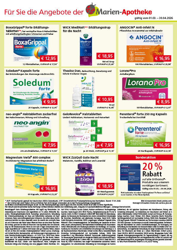 BoxaGrippal® forte Erkältungstabletten 400 mg/60 mg Filmtabletten. Zur Anwendung bei Erwachsenen und Jugendlichen ab 15 Jahren. Wirkstoffe: Ibuprofen, Pseudoephedrinhydrochlorid. Kurzzeitige symptomatische Behandlung der Schleimhautschwellung von Nase und Nebenhöhlen verbunden mit Kopfschmerzen, Fieber und erkältungsbedingten Schmerzen. Sie sollten dieses Kombinationsarzneimittel nur dann anwenden, wenn Sie sowohl eine verstopfte Nase als auch Schmerzen oder Fieber haben. Wenn bei Ihnen nur eine dieser Beschwerden vorliegt, sprechen Sie bitte mit Ihrem Arzt oder Apotheker über eine Behandlung nur mit Einzelsubstanzen. Wenn Sie sich nach 4 Tagen (Erwachsene) bzw. 3 Tagen (Jugendliche ab 15 Jahren) nicht besser oder gar schlechter fühlen, müssen Sie sich an Ihren Arzt wenden. Erkältungstabletten: Enthält Lactose. Erkältungssaft: Enthält Maltitol, Natriummethyl- und Natriumpropyl-4-hydroxybenzoat. Aziende Chimiche Riunite Angelini Francesco – A.C.R.A.F. S.p.A., 00181 Rom, Italien. Stand: Juni 2024; WICK MediNait Erkältungssirup für die Nacht. Anwendungsgebiete: Zur symptomatischen Behandlung von gemeinsam auftretenden Beschwerden wie Kopf-, Glieder- oder Halsschmerzen, Fieber, Schnupfen und Reizhusten infolge einer Erkältung oder eines grippalen Infekts. Warnhinw.: Enthält 18 Vol.-% Alkohol, Sucrose (Zucker), Natrium und Benzoat. Packungsbeilage beachten. Stand: August 2020. WICK Pharma, Zweigniederlassung der Procter & Gamble GmbH, D-65823 Schwalbach; ANGOCIN® Anti-Infekt N. Anwendungsgebiete: Zur Besserung der Beschwerden bei akuten entzündlichen Erkrankungen der Bronchien, Nebenhöhlen und ableitenden Harnwege. Stand 02/20. Repha GmbH Biologische Arzneimittel, 30855 Langenhagen; Soledum® Kapseln forte, Wirkstoff: Cineol. Anwendungsgebiete: Zur Behandlung der Symptome bei Bronchitis, akuten, unkomplizierten, nicht bakteriellen Entzündungen der Nasennebenhöhlen (Rhinosinusitis) und Erkältungskrankheiten der Atemwege. Zur Zusatzbehandlung bei chronischen und entzündlichen Erkrankungen der Atemwege (z. B. der Nasennebenhöhlen). Warnhinweis: Enthält Sorbitol. Maria Clementine Martin Klosterfrau Vertriebsgesellschaft mit beschränkter Haftung, 50606 Köln; Lorano®Pro 5 mg Filmtabletten. Wirkstoff: Desloratadin. Anwendungsgebiete: Zur Besserung der Symptomatik bei allergischer Rhinitis und Urtikaria bei Erwachsenen und Jugendlichen ab 12 Jahren. Mat.-Nr.: 2/51015269-02 Stand: Mai 2022. Hexal AG, 83607 Holzkirchen; neo-angin® Halstabletten zuckerfrei. Anwendungsgebiete: Zur unterstützenden Behandlung bei Entzündungen der Rachenschleimhaut, die mit typischen Symptomen wie Halsschmerzen, Rötung oder Schwellung einhergehen. Zur Anwendung bei Erwachsenen und Kindern ab 6 Jahren. Warnhinweise: Enthält Pfefferminzöl, Isomalt und Ponceau 4R. Packungsbeilage beachten. Stand: Oktober 2024. Maria Clementine Martin Klosterfrau Vertriebsgesellschaft mit beschränkter Haftung, 50606 Köln; Perenterol® forte 250 mg Kapseln. Wirkstoff: Trockenhefe aus Saccharomyces cerevisiae HANSEN CBS 5926 (Synonym: Saccharomyces boulardii). Anwendungsgebiete: Zur Behandlung der Beschwerden bei akuten Durchfallerkrankungen, zur Vorbeugung und Behandlung der Beschwerden von Reisedurchfällen sowie Durchfällen unter Sondenernährung. Zur begleitenden Behandlung bei länger bestehenden Formen der Akne. Für Erwachsene und Kinder ab 2 Jahren. Warnhinweis: Enthält Lactose. Stand: 08/2024. MEDICE Arzneimittel, 58638 Iserlohn; Magnesium Verla® 400 Kapseln. Nahrungsergänzungsmittel. Pro Tagesempfehlung (1 Kapsel): 400 mg Magnesium (als Magnesiumcitrat und Magnesiumoxid). Achten Sie zusätzlich auf eine abwechslungsreiche, ausgewogene Ernährung und eine gesunde Lebensweise. Verla-Pharm Arzneimittel GmbH & Co. KG, 82327 Tutzing.